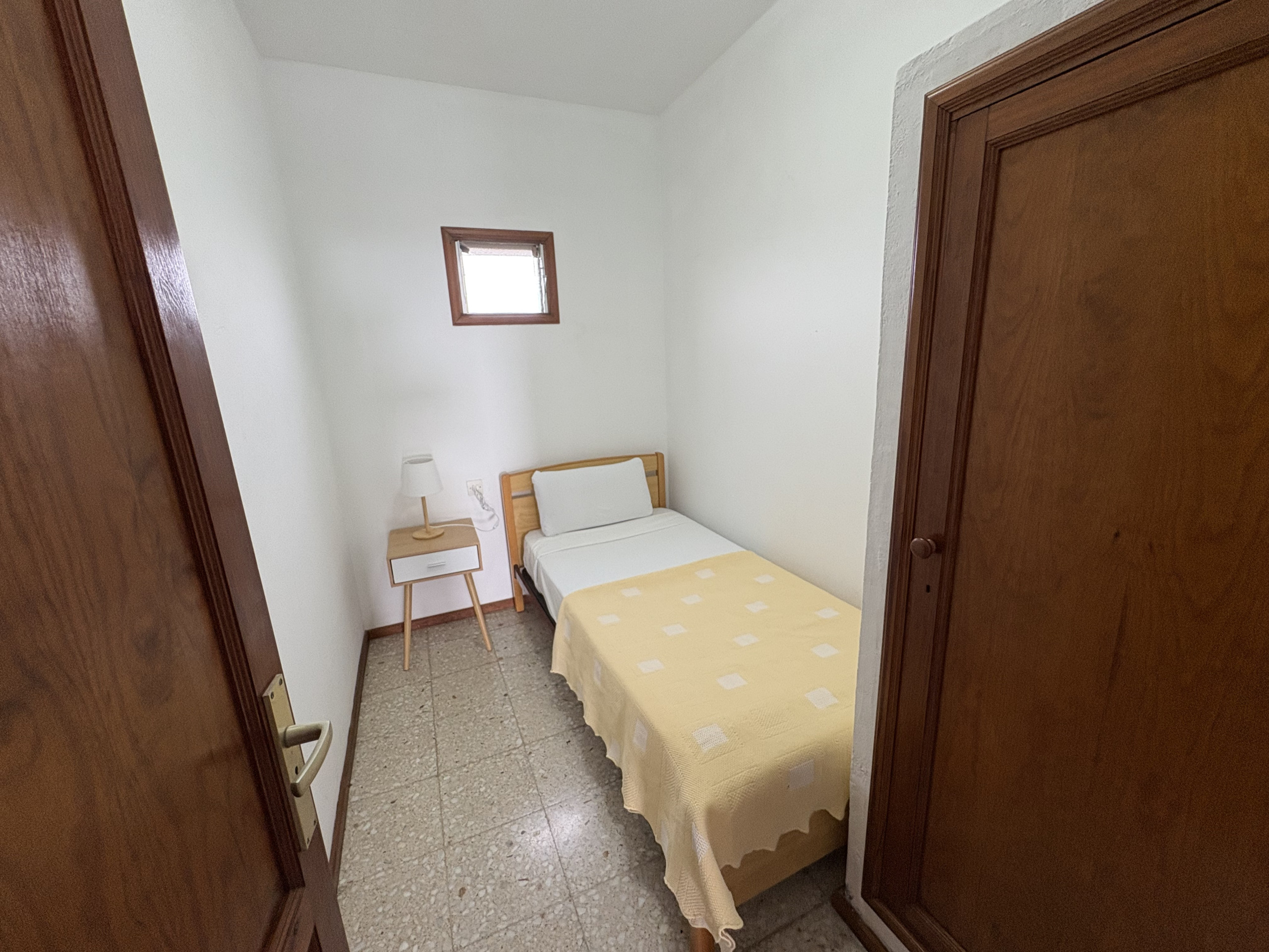 El apartamento cuenta con dos dormitorios bien distribuidos: un dormitorio principal con cama matrimonial y otro con dos camas individuales, además de un sofá cama adicional que permite alojar cómodamente a todos los miembros de la familia. La zona de descanso está equipada con una caja fuerte para guardar objetos de valor y una plancha para mantener su ropa impecable.